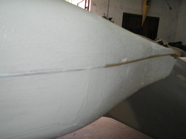 Luego de lijar y dar la forma que me pareció mas agradable cubrí la espuma con cinta de enmascarar, aplique abundante cera y procedí a laminar con recortes de tela de 220 Gr.