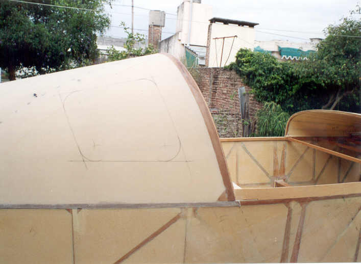 Nota: Toda la cubierta esta solamente apoyada en el fuselaje y sostenida por prensas y unas trabas que tienen las cuadernas de espuma y terciada para luego de laminado el exterior, poder sacarla y laminar el interior.