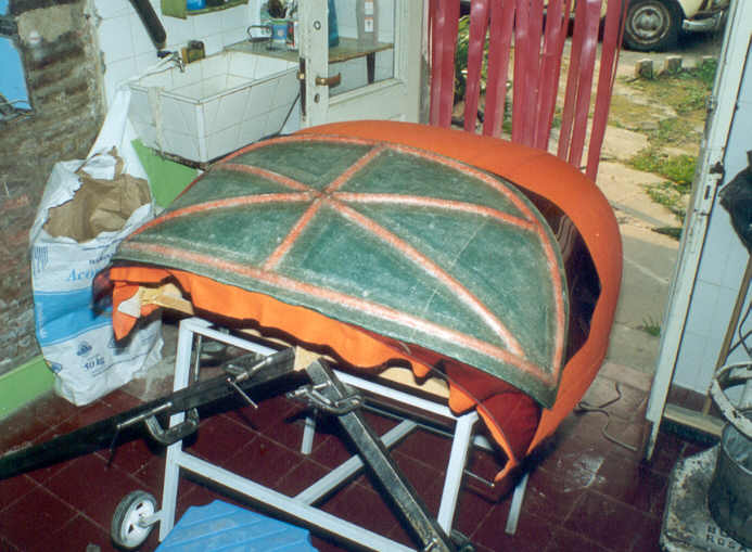 Con todo esto en mi poder, procedo a cubrir el molde original de la cabina con tela pañolenci (lo que se ve en color naranja), y lo adhiero con cemento de contacto. De esta manera se evita que el acrílico se ralle cuando se lo apoya sobre este. Previo a colocar esta tela, utilizo el molde para laminar sobre el, tres moldes, cada uno un poco mas grande al tamaño de cada una de las ventanas laterales y otro del parabrisas, estos son para poder prensar los acrílicos calientes contra el original y lograr así su forma definitiva. (olvidé tomar un foto de este proceso pero mas adelante se pueden ver ya terminados y en acción).