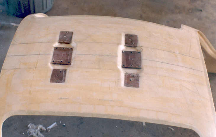 Luego del marcado, procedo a calar la espuma y colocar dentro de ella seis soportes de madera terciada de 6 mm., con insertos de acero roscado en el lugar donde irán atornilladas las bisagras. Por supuesto que para pegarlo en su lugar y posterior laminado arme todo el conjunto completo y alinee sus ejes pivotantes con un caño estructural, lamentablemente olvide tomar una foto del proceso de pegado para que se pueda ver como se mantenían alineadas las cuatro bisagras.