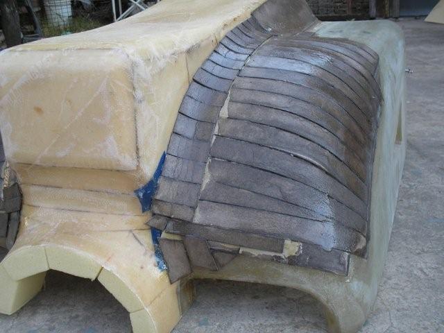 Con muchos trozos de la misma cubriendo el lugar para comenzar a tallar la forma, estos los pego con la masilla que formo con resina poliéster y talco industrial, muy económica y simple de preparar.