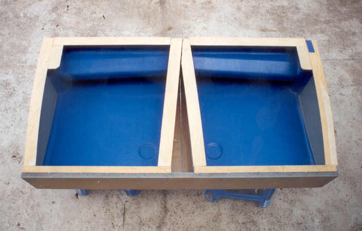 Luego de esto lamine sobre una superficie plana y encerada, cinco telas de vidrio de 209 grs. para formar las tapas de los mismos, cuando estuvieron curadas las corte con la forma necesaria y las pegue a los tanques sosteniéndolas con el peso de unos caños estructurales.