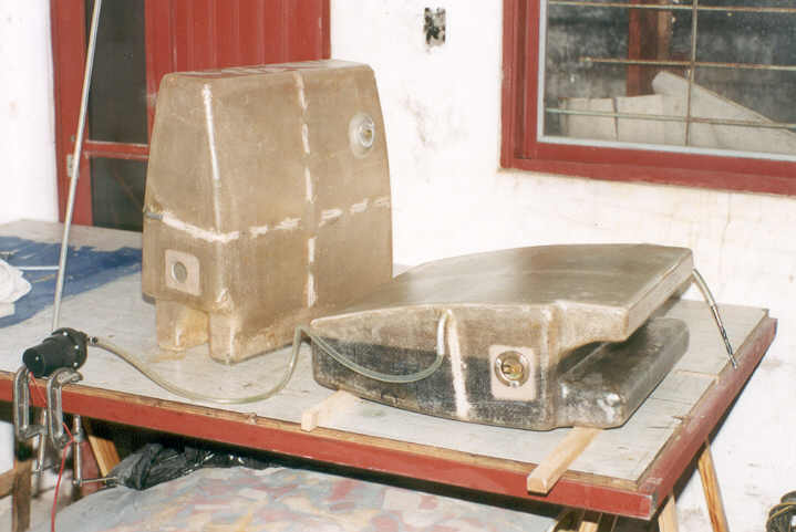 La construcción en si es relativamente sencilla, "al menos eso creía", Comencé armando un molde hembra en fibrofacil de 16 Mm. con la forma de los tanques, de manera de poder laminar dentro de ellos el fondo y los laterales para luego taparlos con una plancha plana que laminare sobre un vidrio. como se aprecia en la foto de arriba, la hendidura por donde pasan los cables de comando la tuve que armar separada del resto del molde, esta se coloca en su lugar y se atornilla para luego del laminado desatornillarla y poder desmoldar.